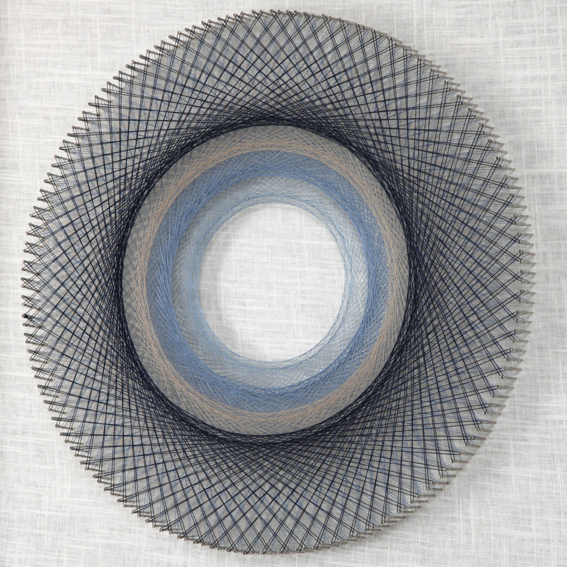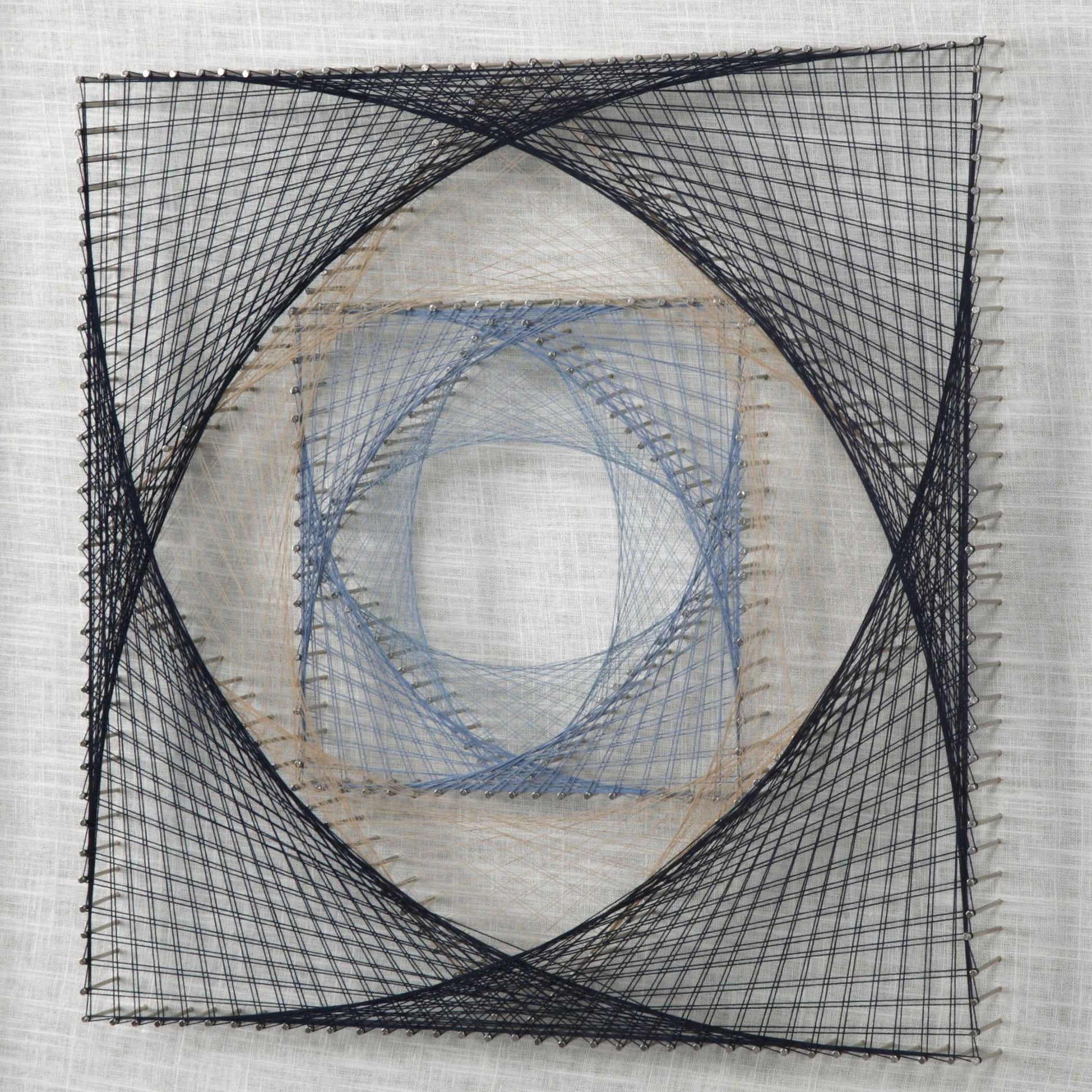 These Fun Shadow Boxes Feature 3-dimensional Layered String Art, Hand Threaded Around Individually Hammered Pin Nails In Easy Shades Of Blue, Over A Neutral Linen Backing With A Black Pine Frame.