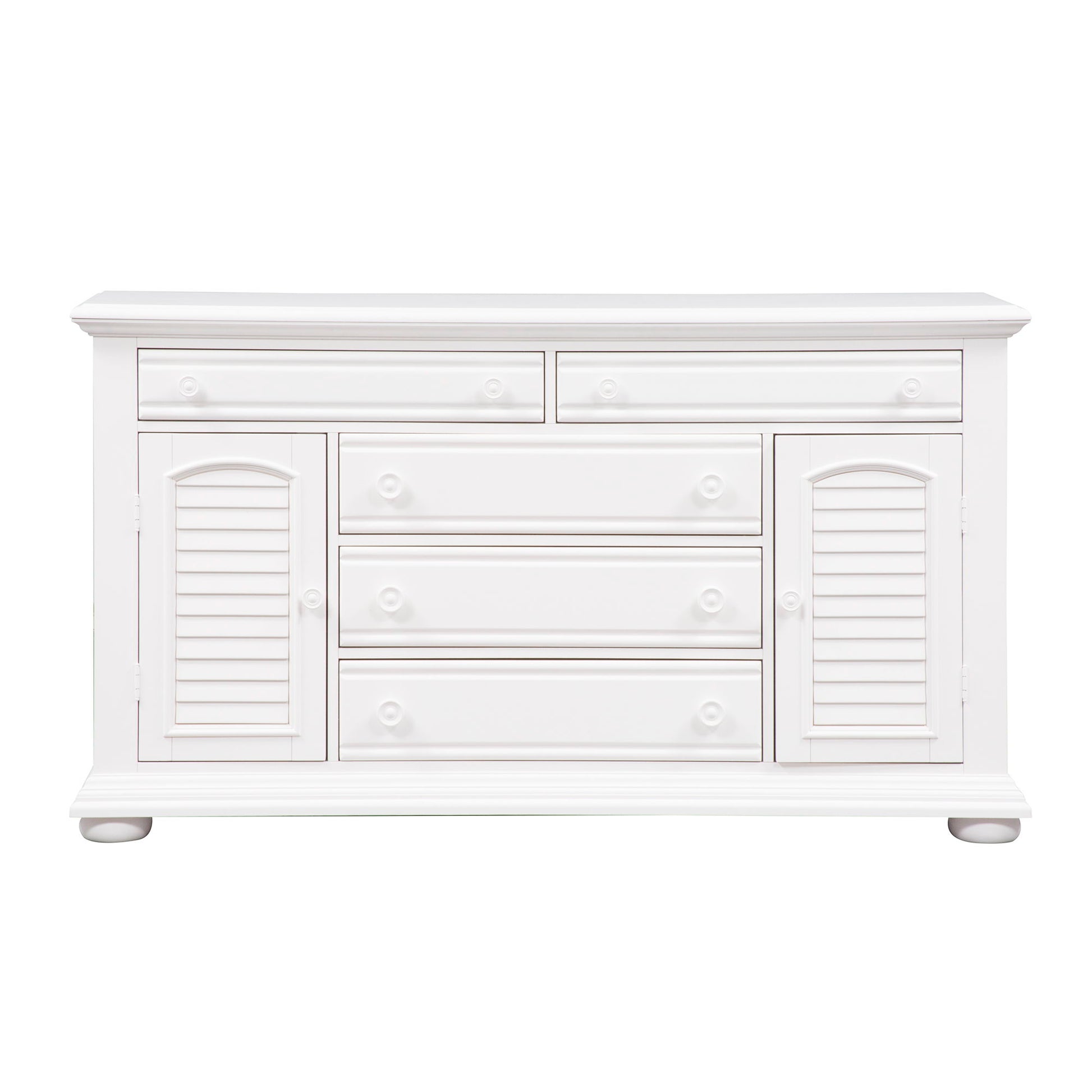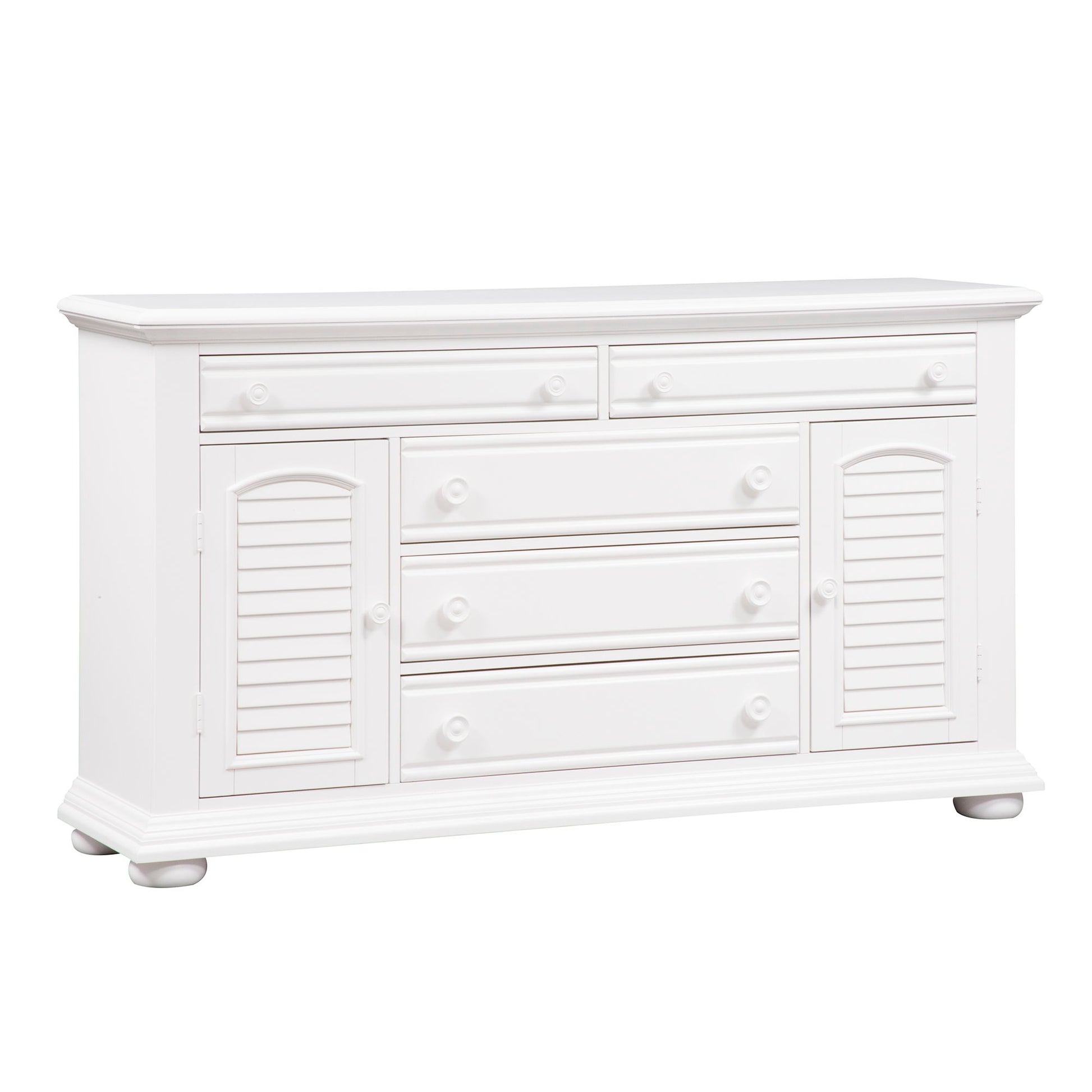 Cottage design is always in fashion. Summer house features the best of cottage with louvered panel accents in an Oyster White finish.