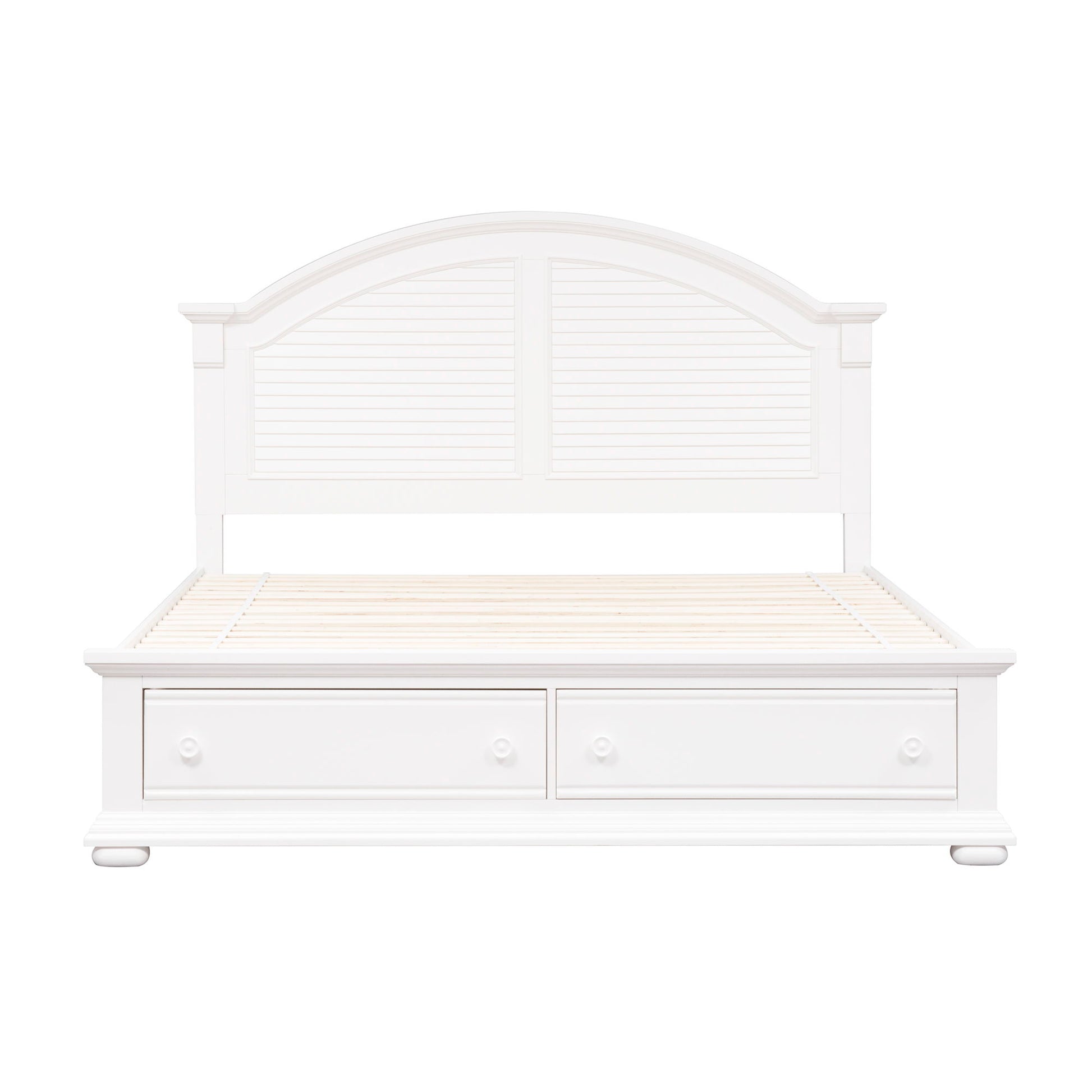 Live life beautifully with the Summer House I storage bed, dresser, and mirror. Crafted of poplar and pine solids this kit features an oyster white finish, bead molding, bun feet, full extension drawers with felt lined top drawers, and is accented with wooden knob hardware. The storage bed features louvered panels, arched crown molding, and two felt lined drawers in the footboard. The dresser has two louvered panel doors and five drawers including two smaller flip down top drawers. Attach the arched louvered panel mirror with a beveled edge with the included bolt-on supports. With cottage design always in fashion, make the Summer House I a staple in your home.