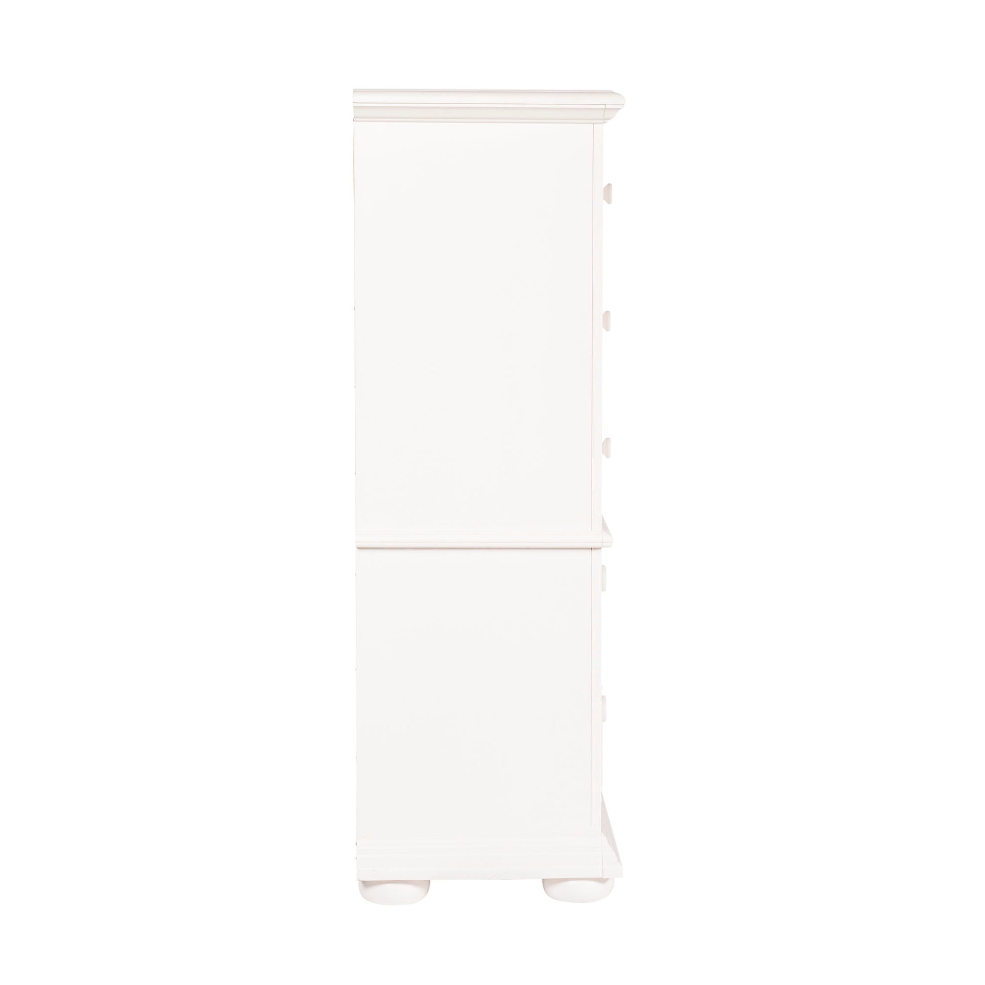 Cottage design is always in fashion. Summer house features the best of cottage with louvered panel accents in an Oyster White finish.