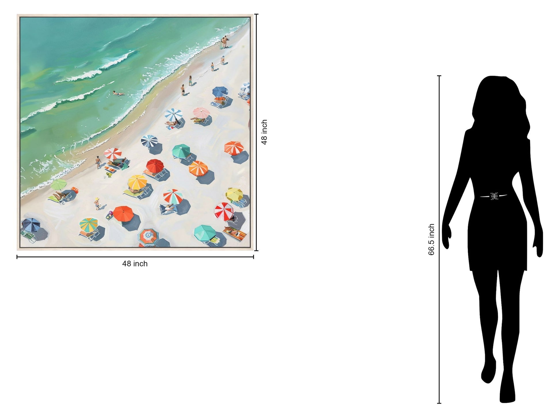 “Overlooking the Coast” captures a serene beach scene from a unique aerial perspective, showcasing colorful umbrellas and sunbathers along the shore. This hand-painted canvas in a light beige frame brings coastal charm and tranquility to any space. Crafted with high-quality canvas and hand-applied accents, it offers texture and depth, making it a captivating focal point for living rooms, beach houses, or sunrooms. Ready to hang, this piece combines artistry with a meaningful social impact, donating a meal to a hungry child with each purchase.
