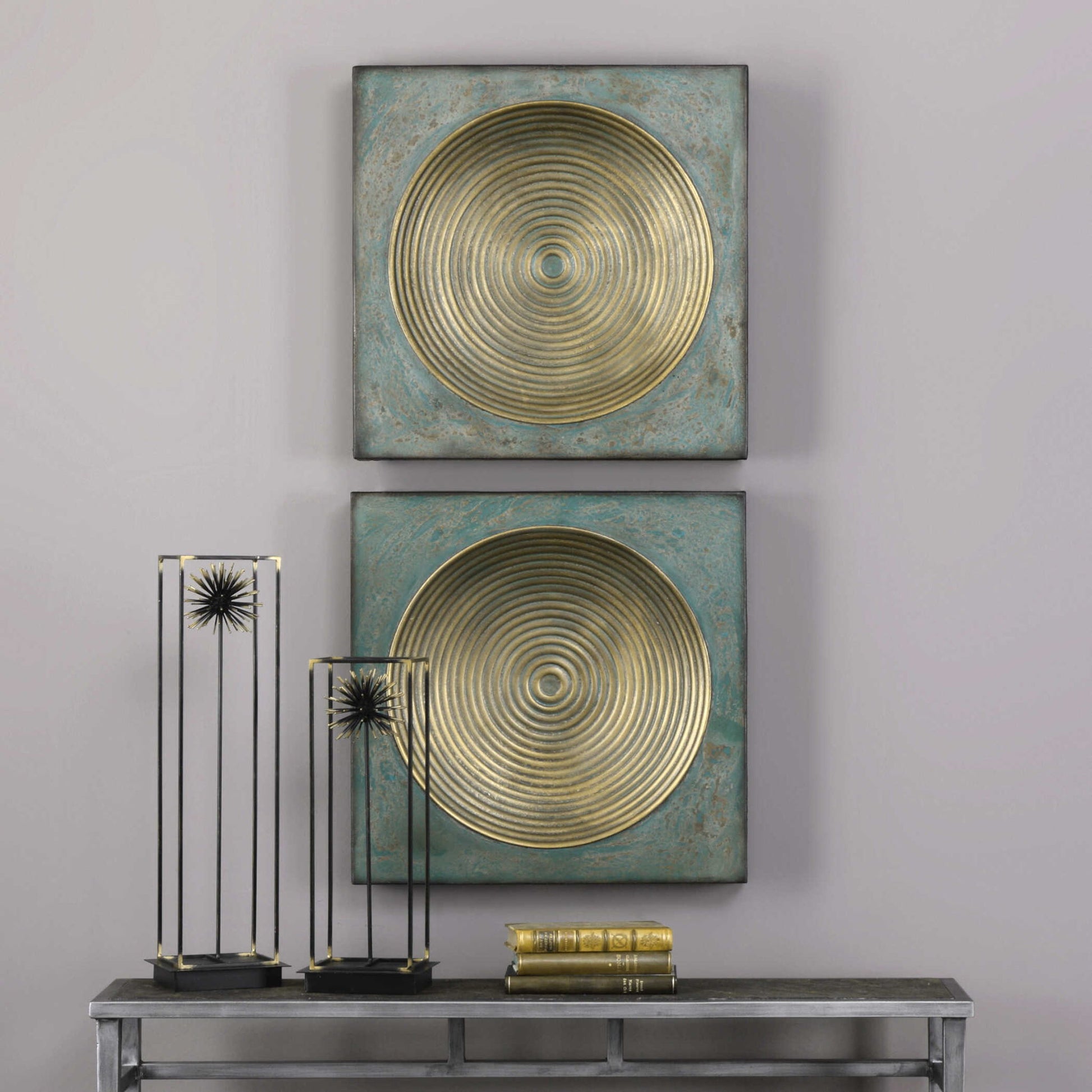 Aged Iron Squares Featuring A Ribbed Concave Center In Antique Gold, Washed With A Heavy Patina Glaze Revealing Ivory Undertones.