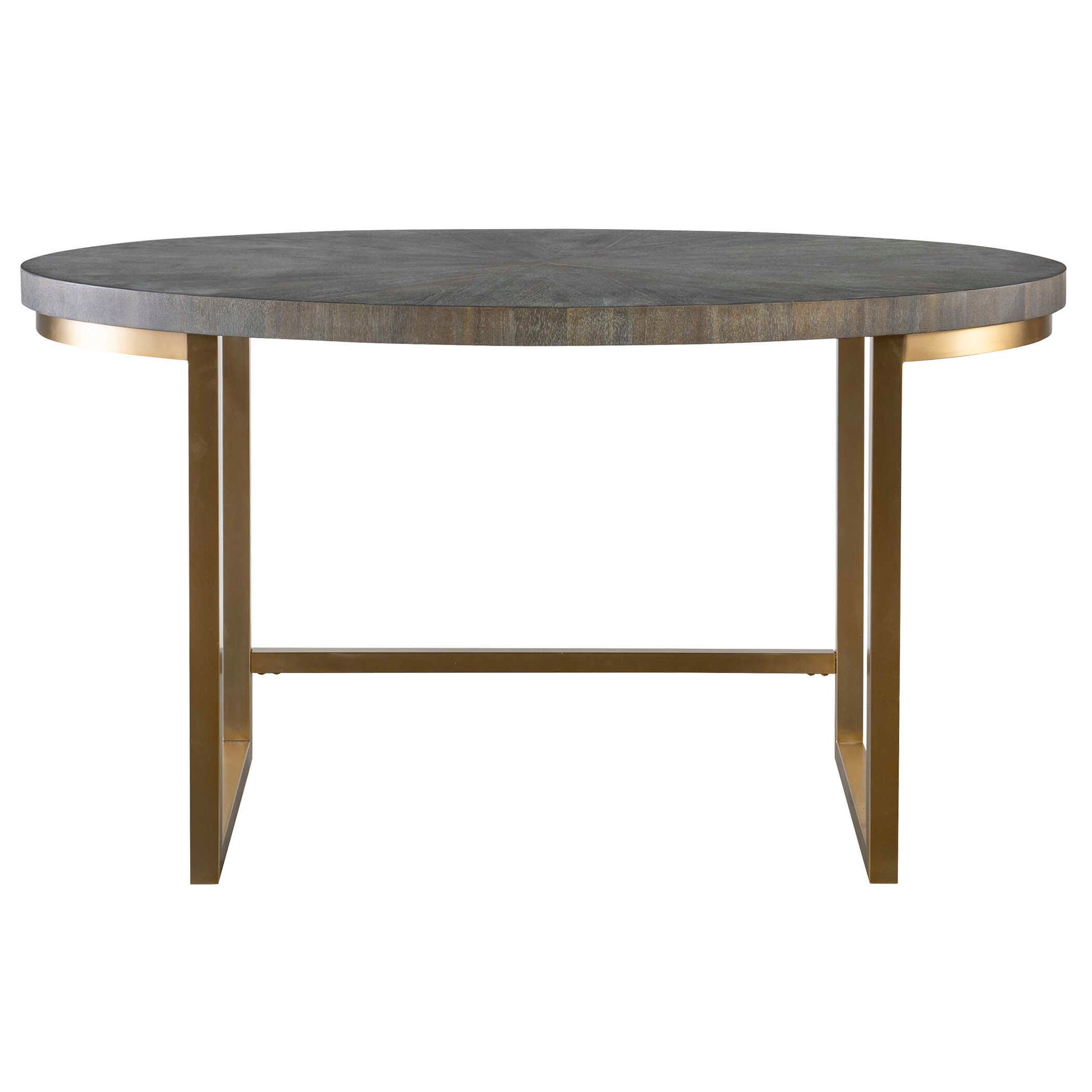 Contemporary In Style, This Oval Writing Desk Features A Bold Stainless Steel Base Plated In Brushed Brass With An Acacia Veneer Top In A Dark Walnut Stain Washed With A Light Gray Glaze.