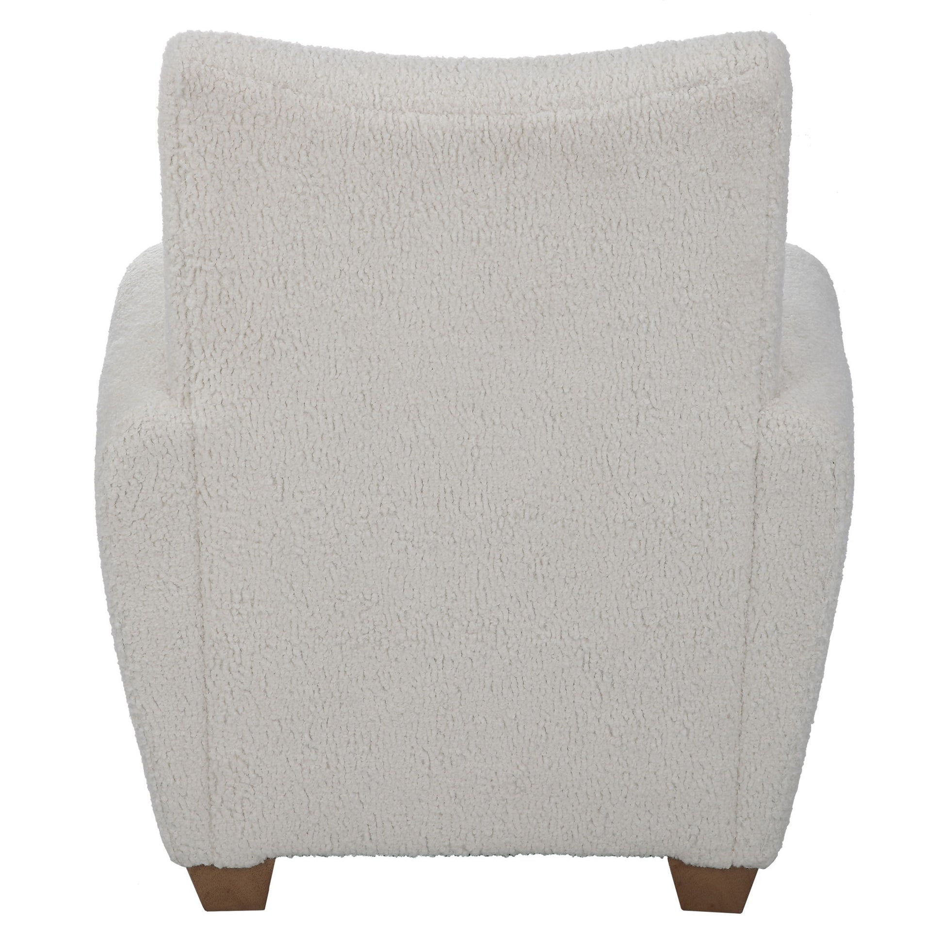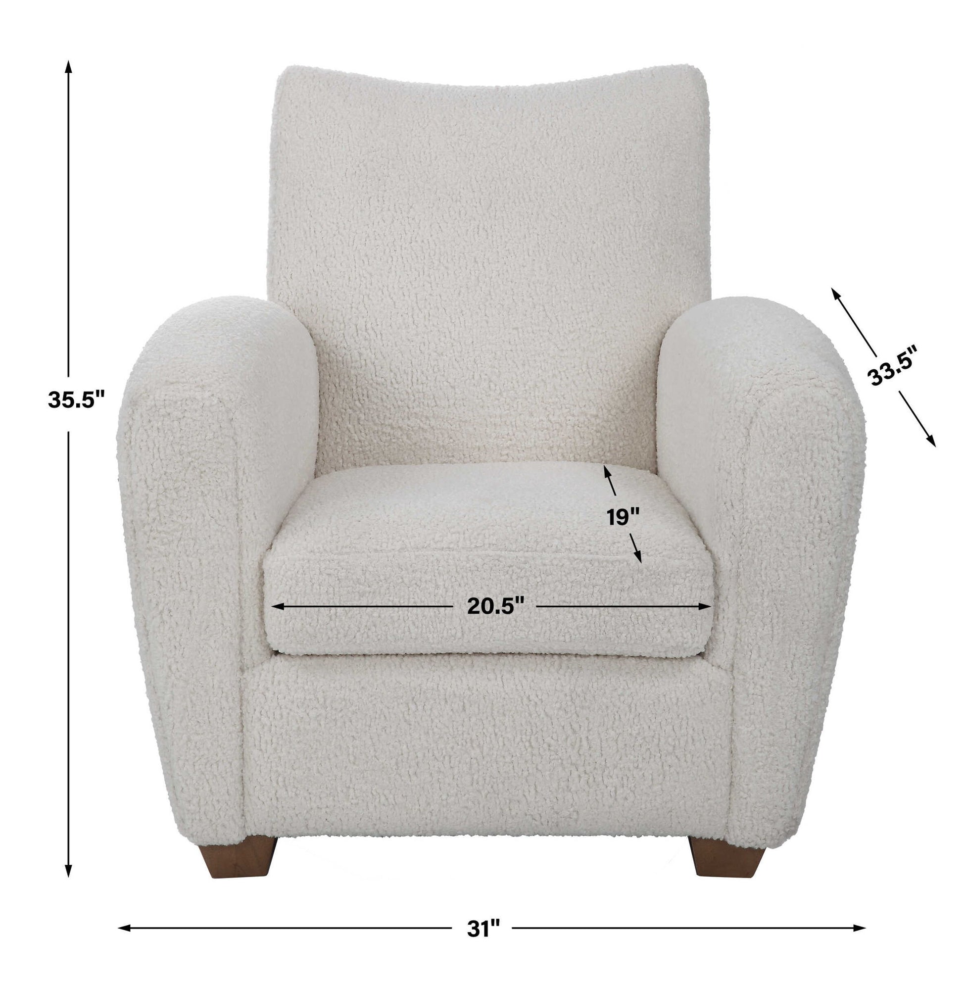 With Its Curved Track Arms And Supportive Back, This Cozy Accent Chair Is The Perfect Balance Of Comfort And Style. Fully Upholstered In A Soft Off White Faux Shearling And Accented By Walnut Stained Wooden Feet.