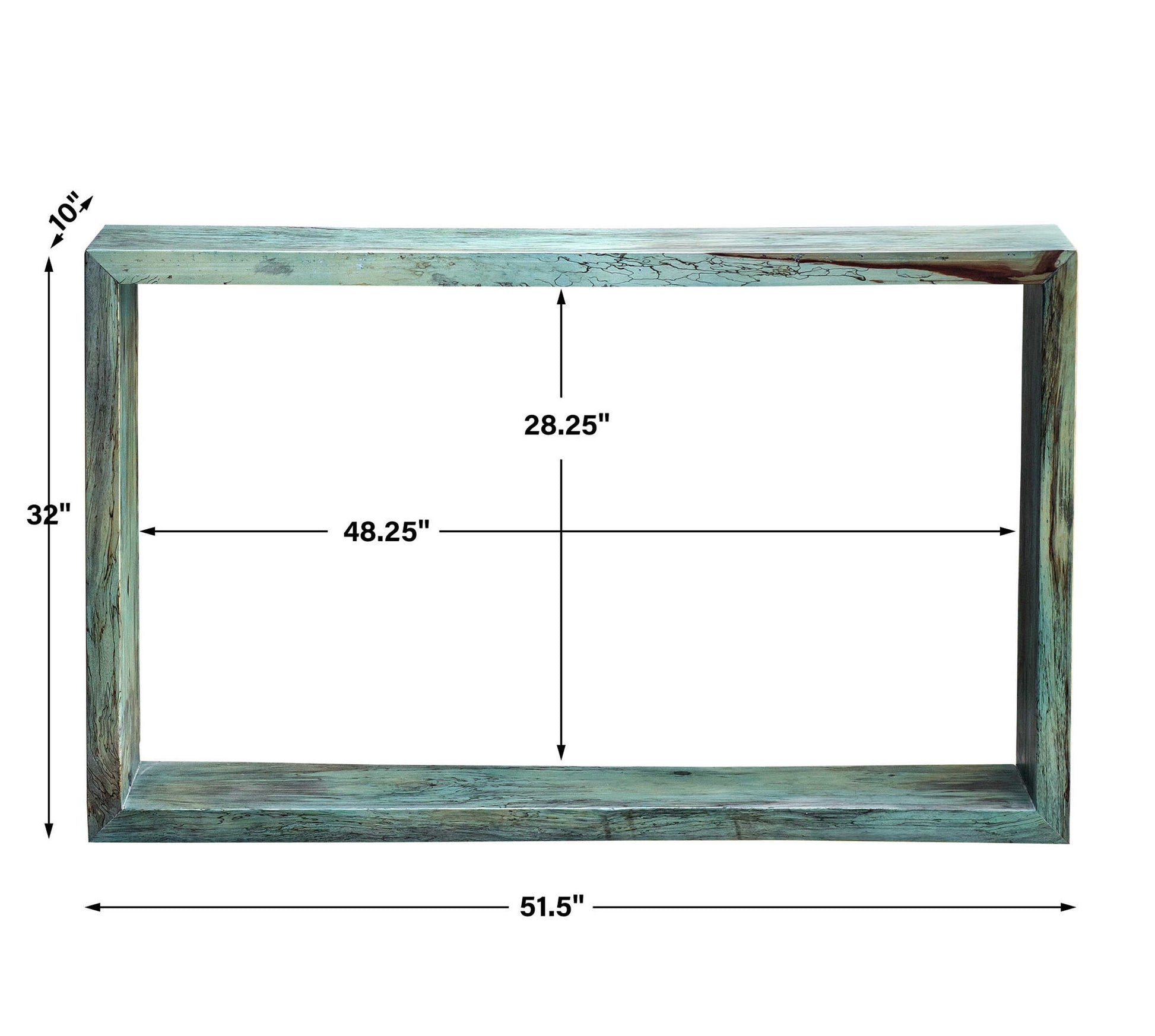 This Fun Statement Console Table Features Naturally Spalted Tamarind Wood, Finished In A Soft Caribbean Blue-green. Cracks And Variations In The Grain Are Natural To This Type Of Wood.