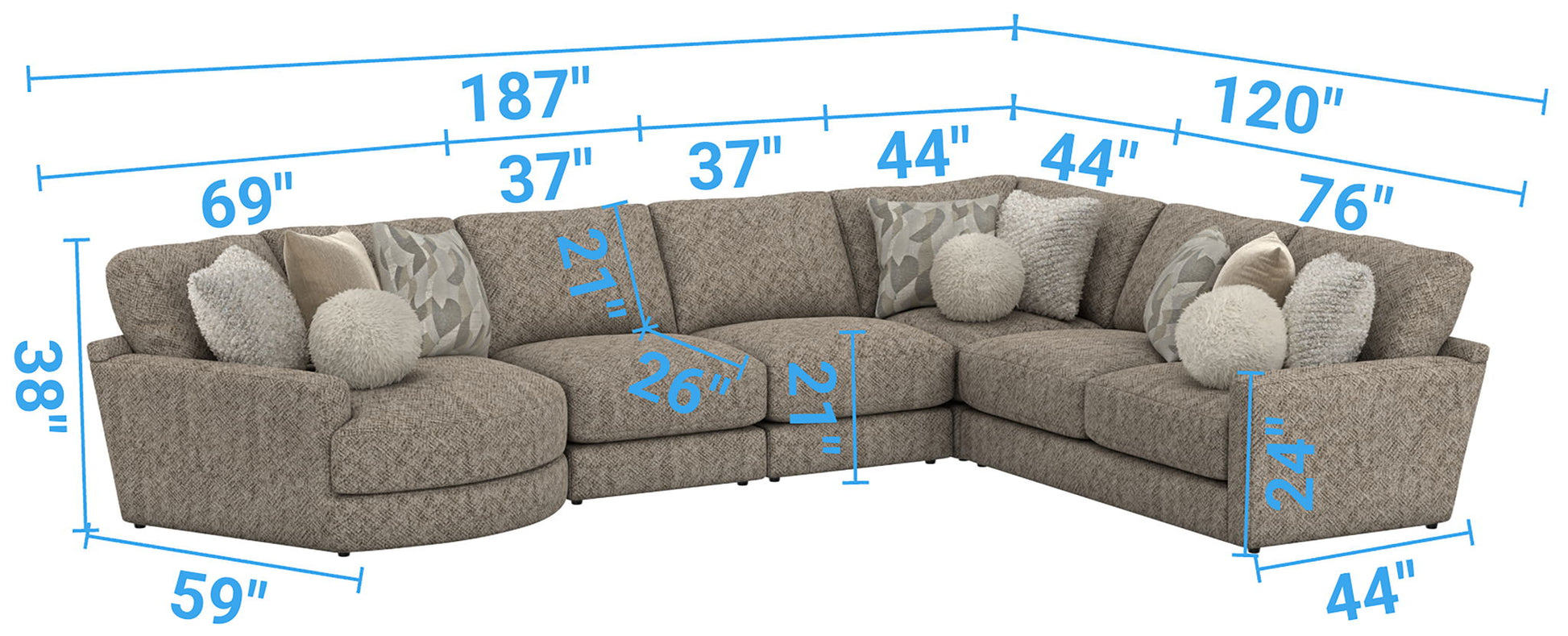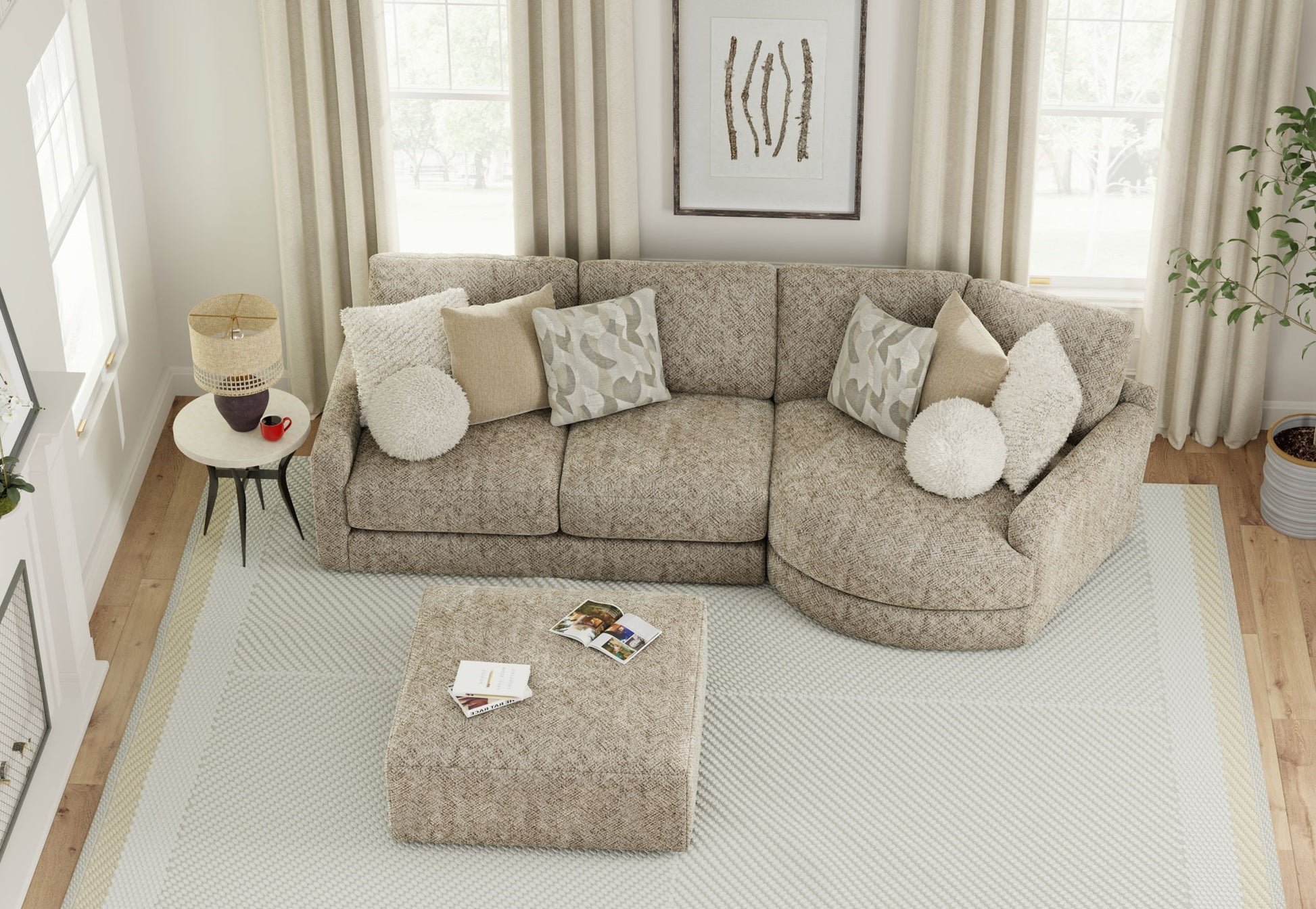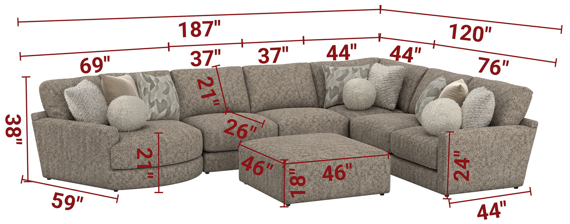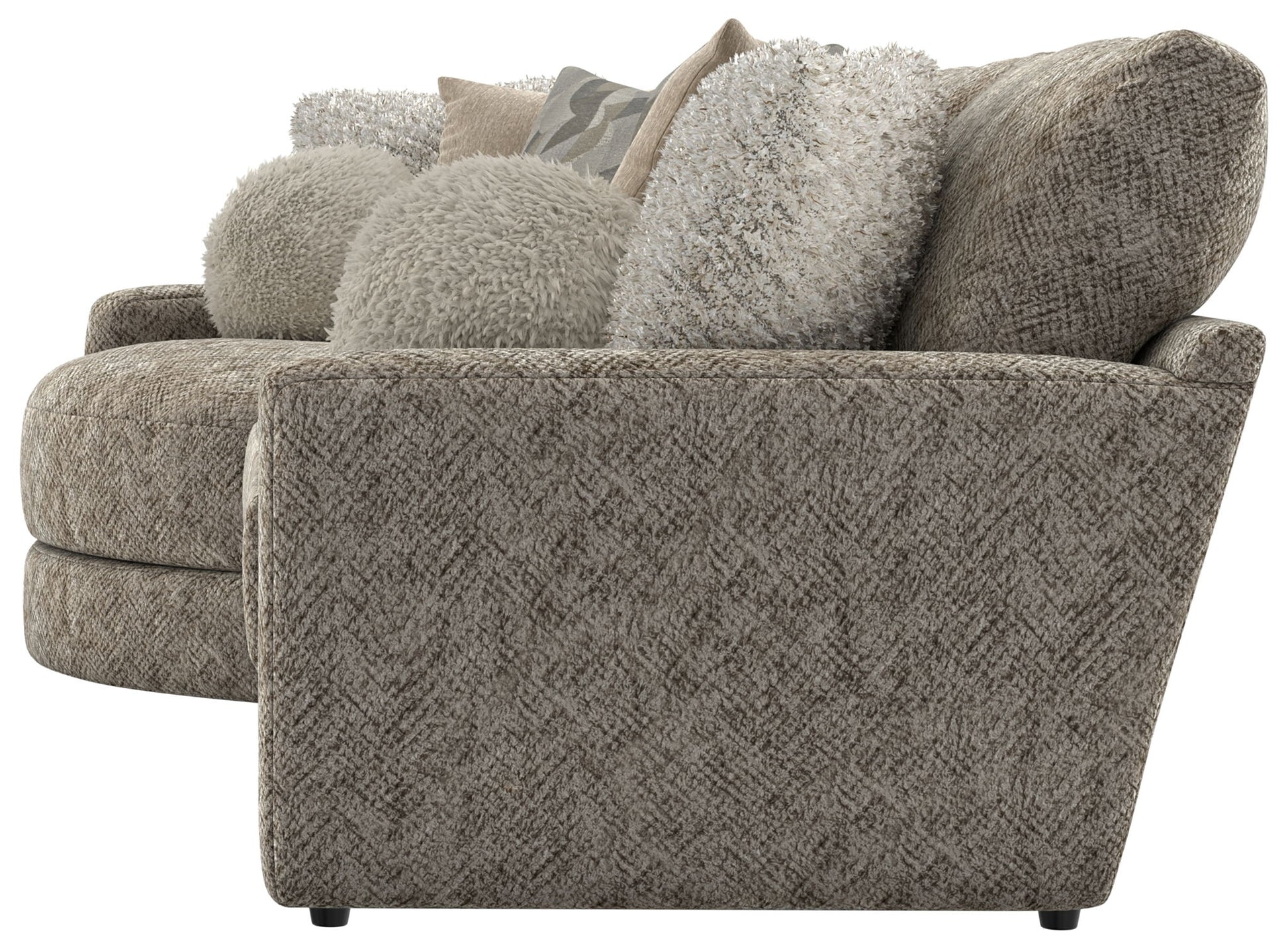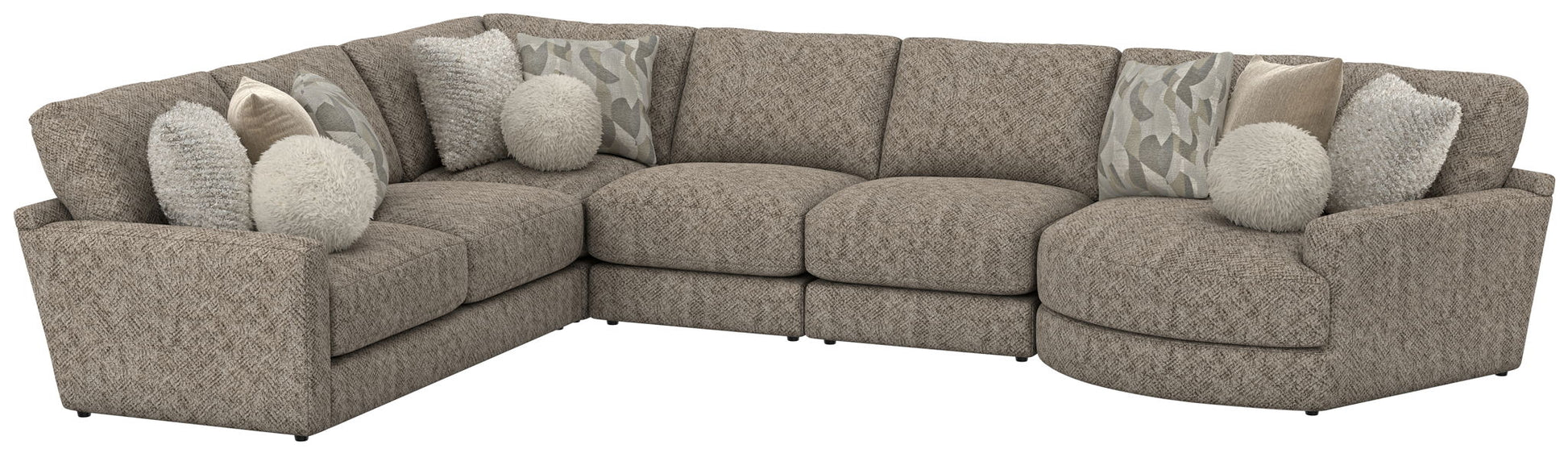 Turner features an assortment of individual pieces, including an interesting Piano Wedge with a curved seat front. This stationary Modular Sectional group features our Cuddler Cushion for ultimate comfort and is available in one color: Mushroom.