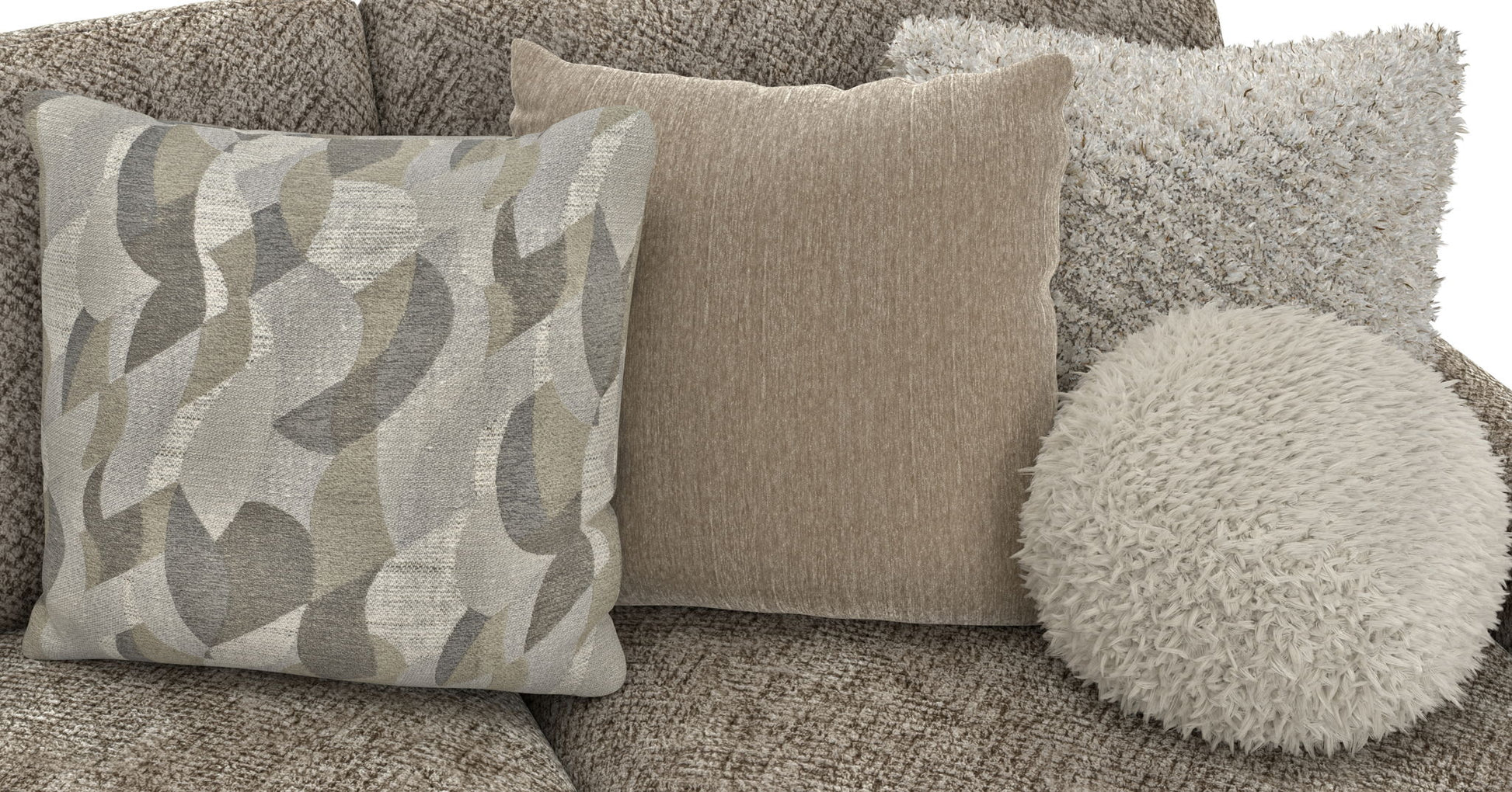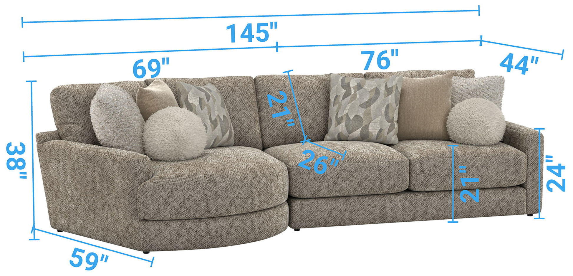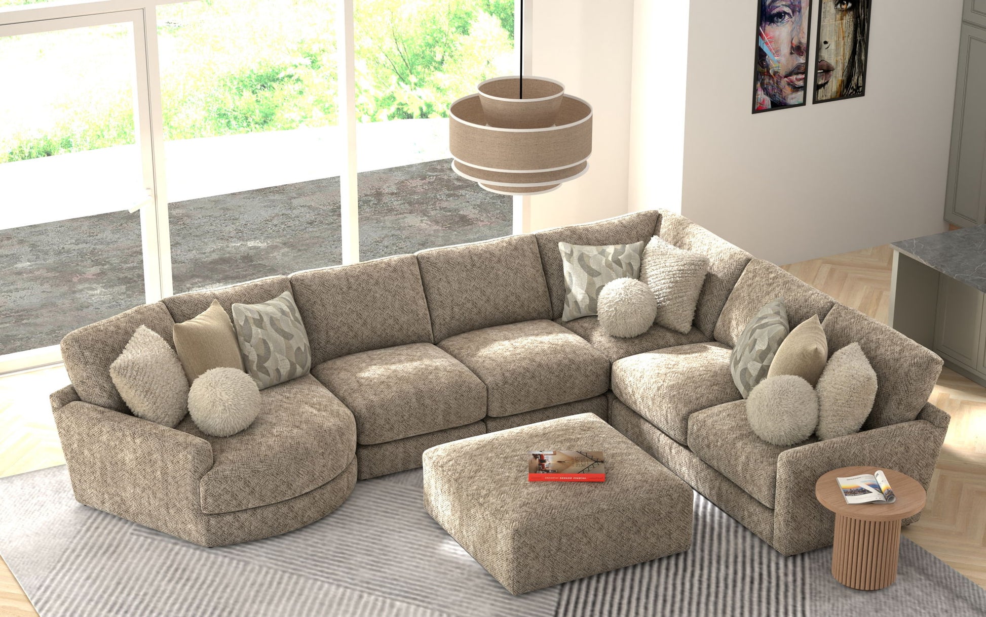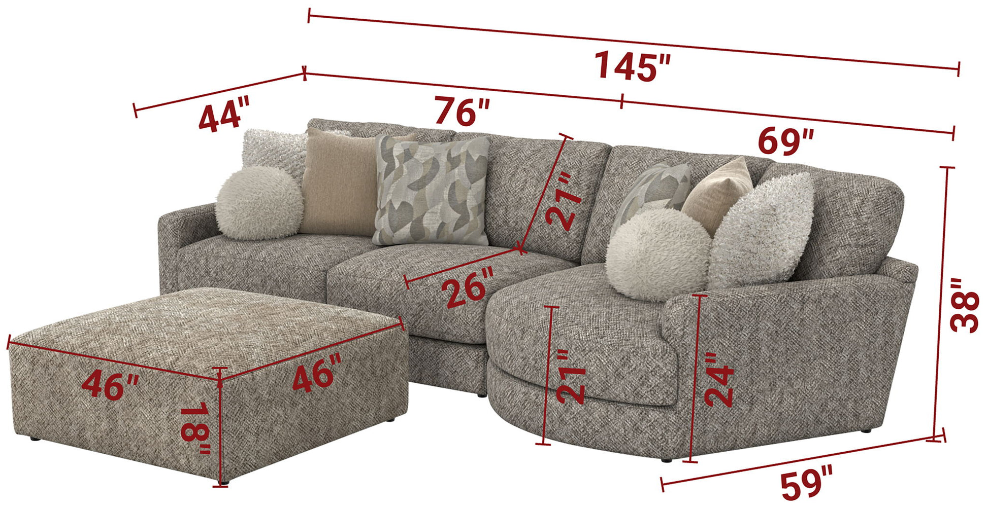 Turner features an assortment of individual pieces, including an interesting Piano Wedge with a curved seat front. This stationary Modular Sectional group features our Cuddler Cushion for ultimate comfort and is available in one color: Mushroom.