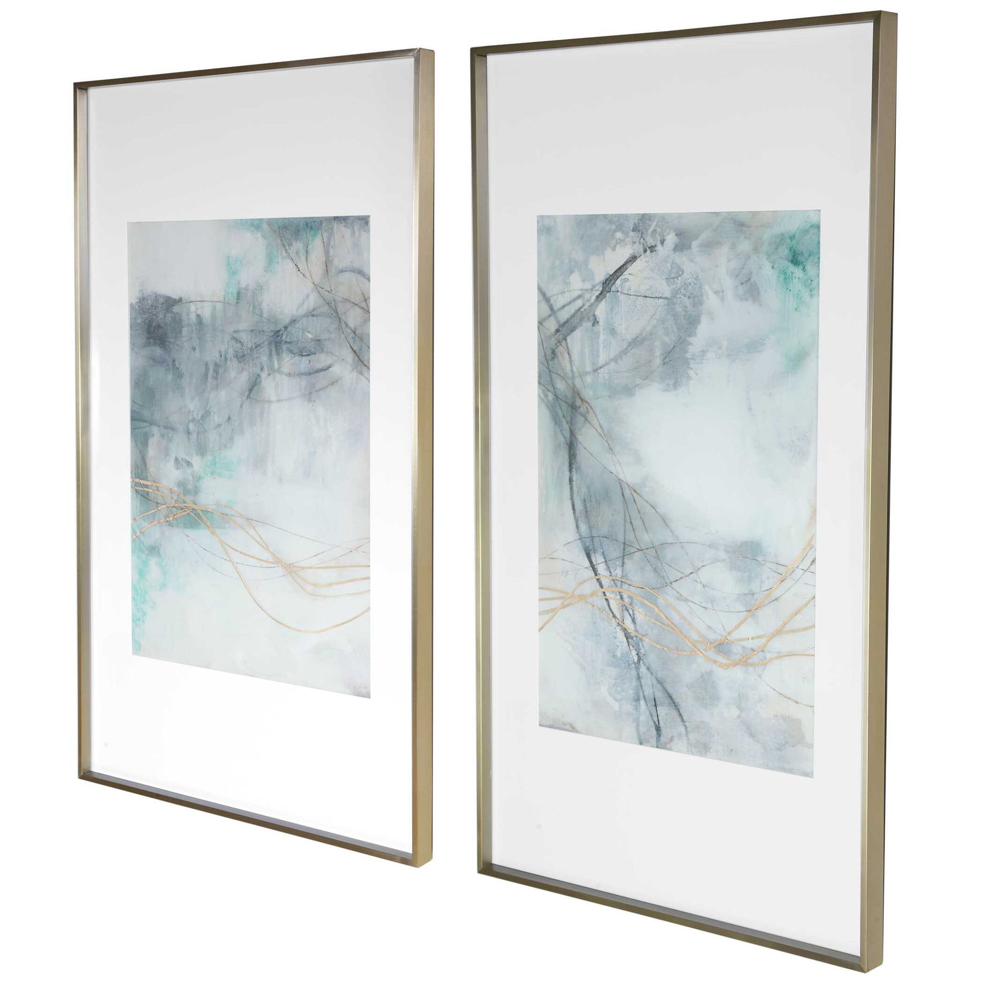 Elegant Abstract Prints Showcase Soft Shades Of Aqua, Charcoal Gray, And Ivory. Large White Matting And Petite Brushed Gold Plated Stainless Steel Frames Create A Timeless Look. Artwork By Jennifer Goldberger.