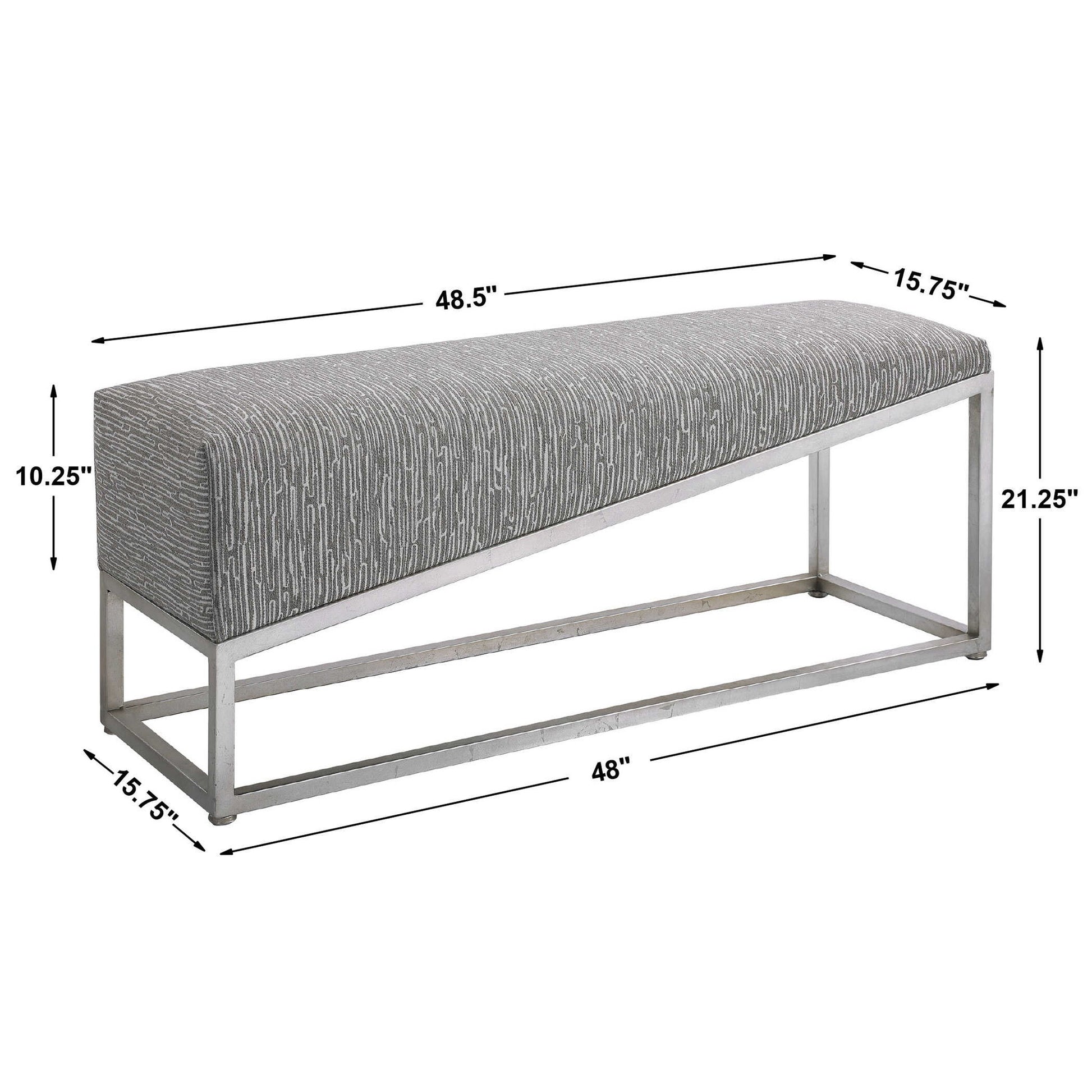 Showcasing Sleek Angular Lines, This Bench Is The Perfect Modern Accent. The Forged Iron Base Is Finished In Brushed Silver Leaf And Is Accented By A Medium Gray And White Geometric Fabric.
