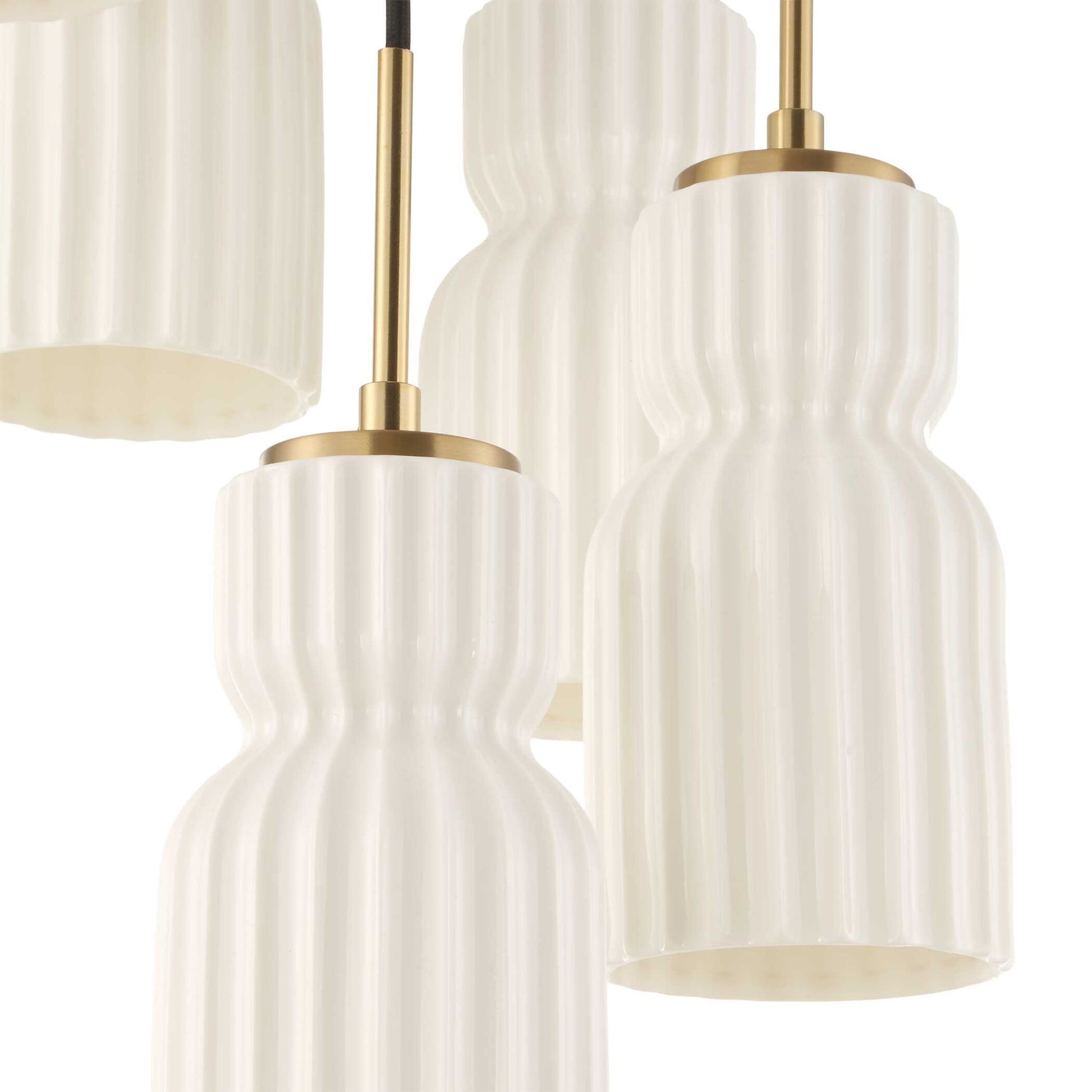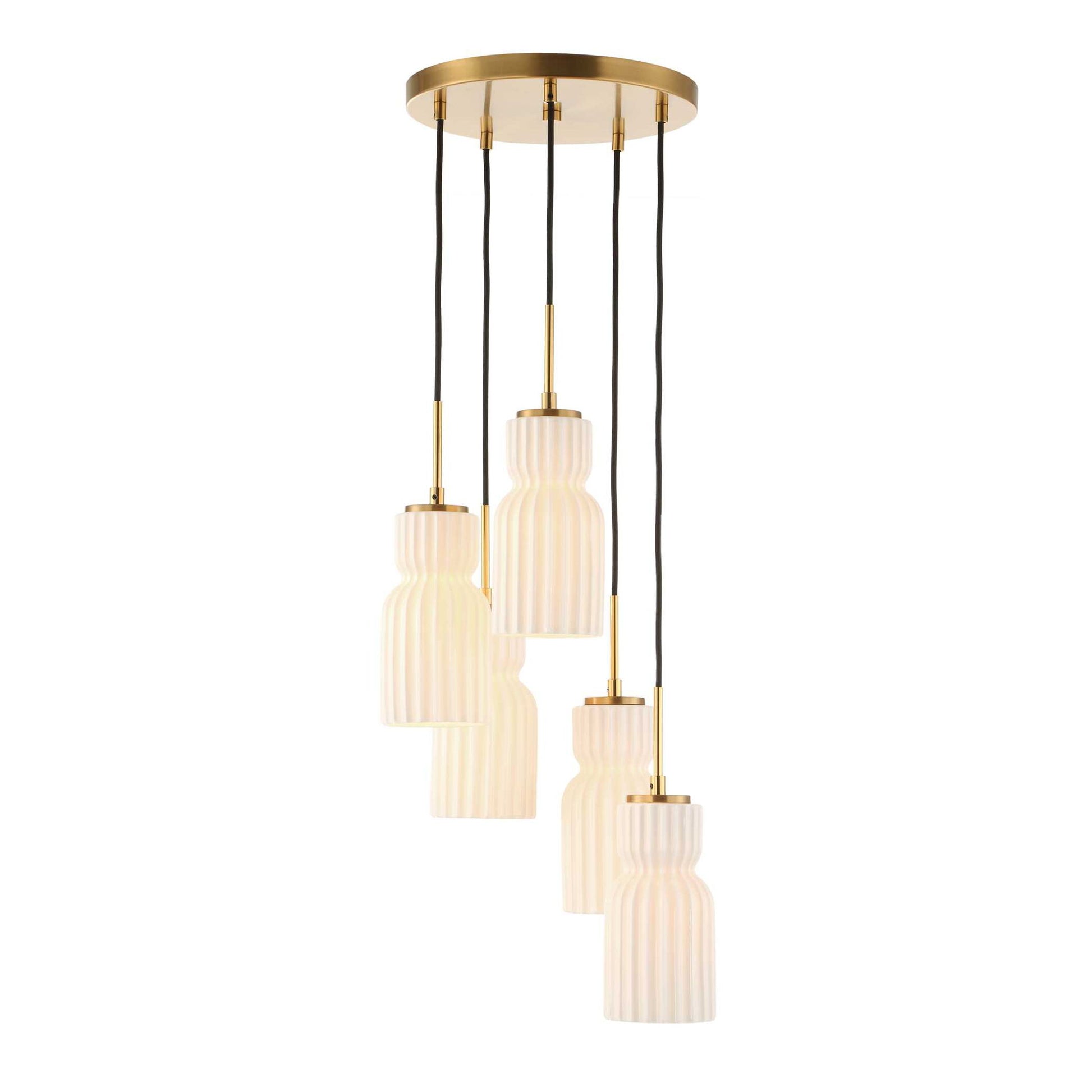 Cluster Pendant With 5 Ceramic White Linear Textured Pendants, All Enhanced With Black Fabric Cord And Finished In Warm Brass. 5-60 Watt Max Edison Sockets. Bulbs Not Included. Supplied With 15' Wire For Each Pendant For Adjustable Installation.