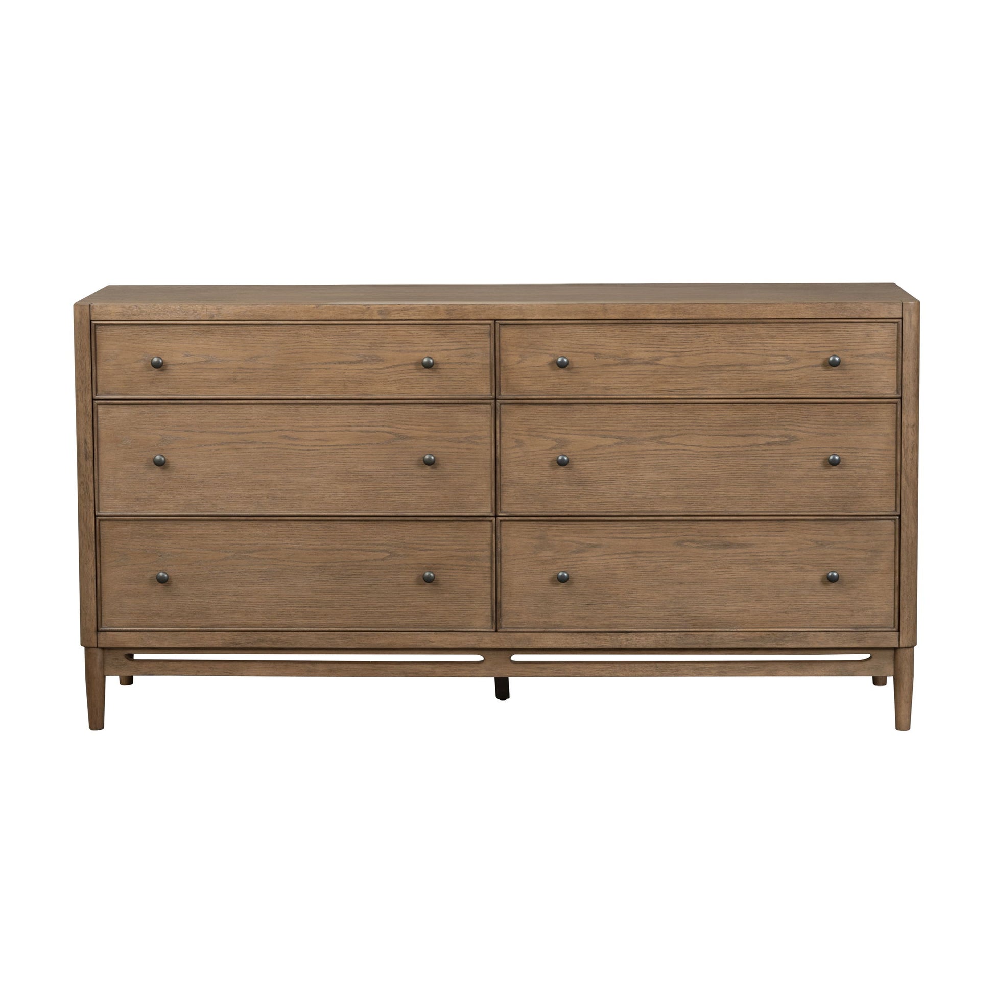 Make a statement with the Verona dresser, designed for those seeking true transitional elegance. Its soft curved base details and rich medium brown oak finish create an elevated bedroom space. Fashioned from rubberwood solids and white oak veneers, and adorned with antique bronze hardware, this dresser is sure to be an enduring staple in your home. With ample space in six soft-closing drawers, the Verona is the ultimate in functionality and sophistication.
