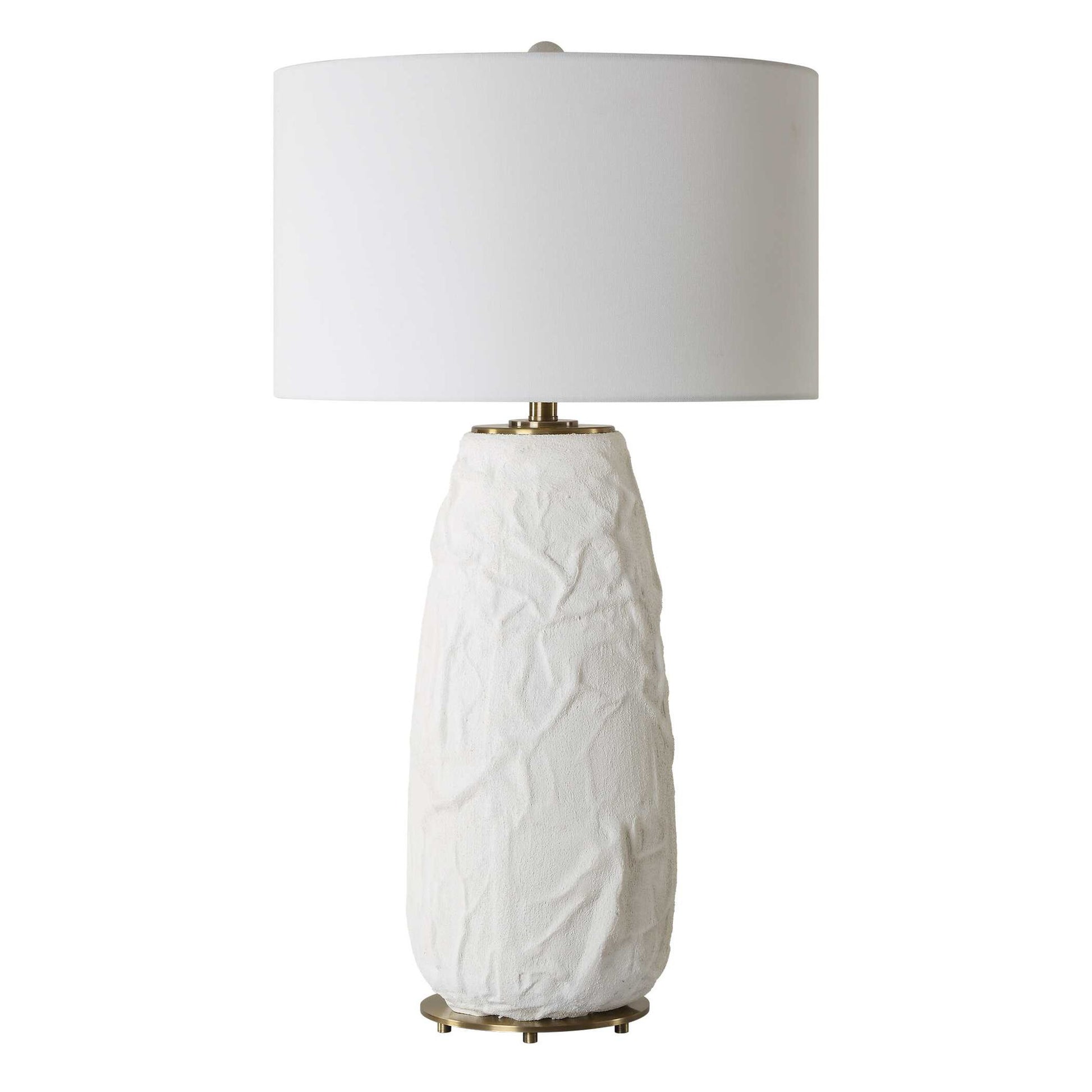 The Vida Table Lamp Base Features A Ceramic Base With A Uniquely Textured Surface And Soft, Flowing Lines. Finished In A Chalk White Glaze And Accented With Plated Brushed Brass Accents And Matching Textured Finial. The Large Round Drum Hardback Shade Is Made In A Casual White Linen Fabric.