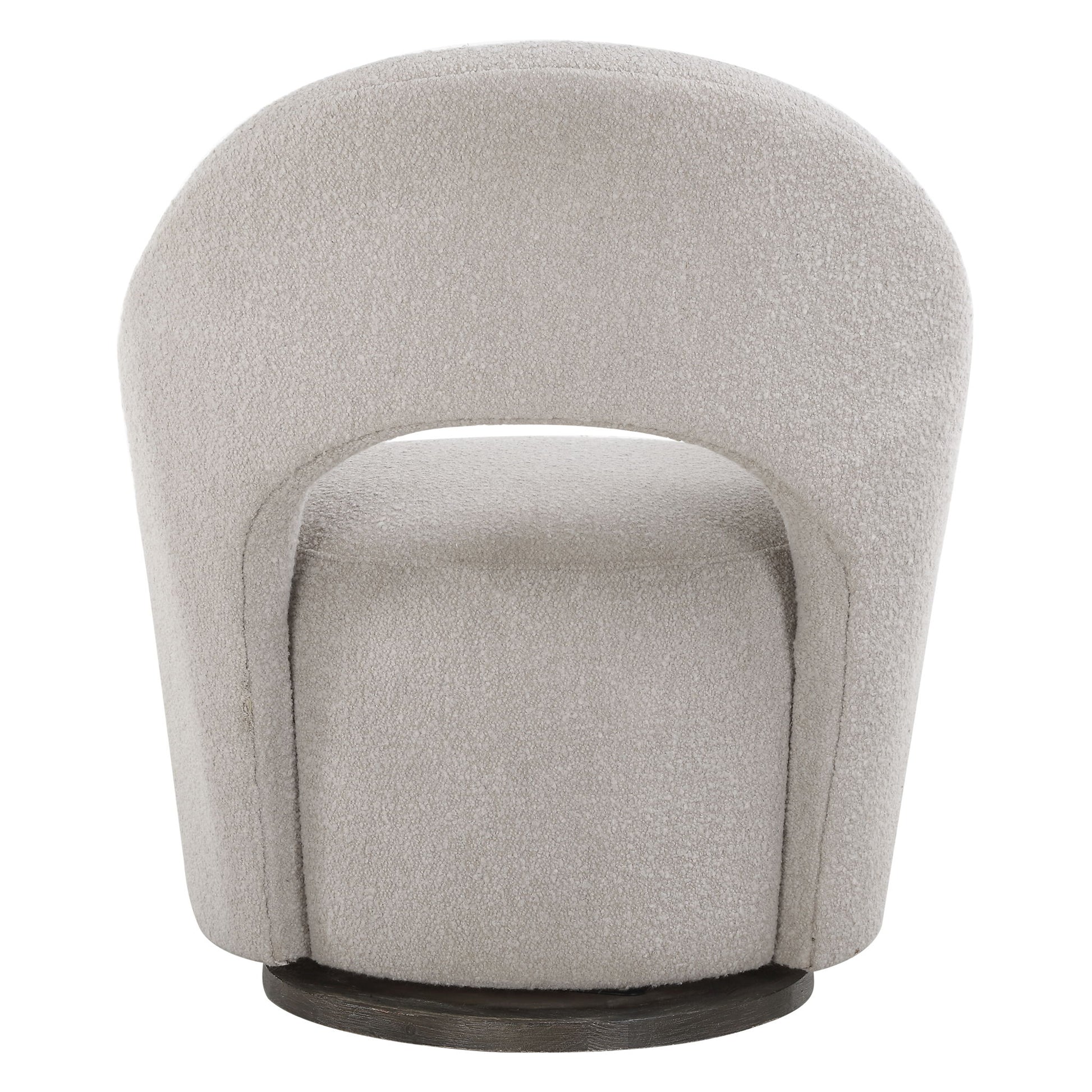 Gentle Curves And Fun Cutouts Give A Unexpected Twist In The Wander Swivel Chair. Upholstered In An Oat Toned Polyester Blend With Wool-like Texture, Resting Atop A Dark Walnut Finished Base That Peeks Out In The Back. Has A Toxin-free, Eco Friendly Treatment To Help Resist Water Based Stains.