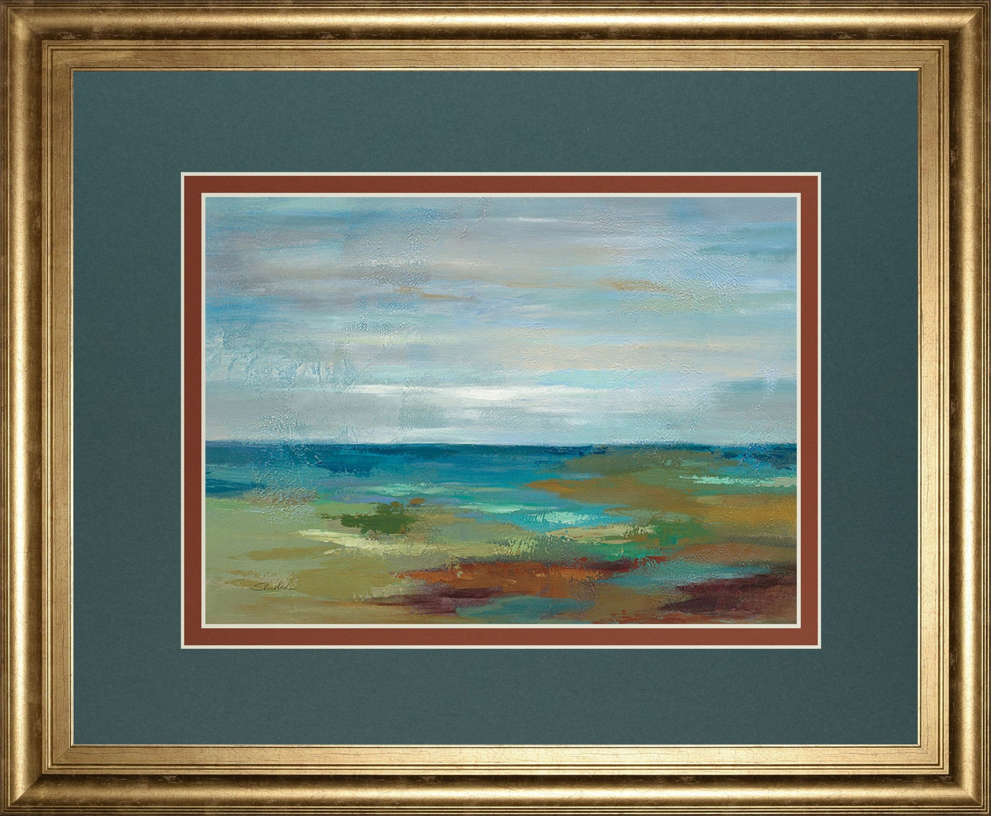 Step into a peaceful coastal escape with this beautifully framed artwork that captures the essence of serene seaside landscapes. The harmonious blend of blues, greens, and earthy tones creates a soothing atmosphere reminiscent of gentle waves and tranquil shores. Encased in a radiant gilded frame with double matting in complementary hues, this piece offers a refined gallery-style presentation that elevates any living room, bedroom, or office space. Crafted with premium materials and real glass, it arrives ready to hang and infuses your home with calm sophistication and timeless beauty.